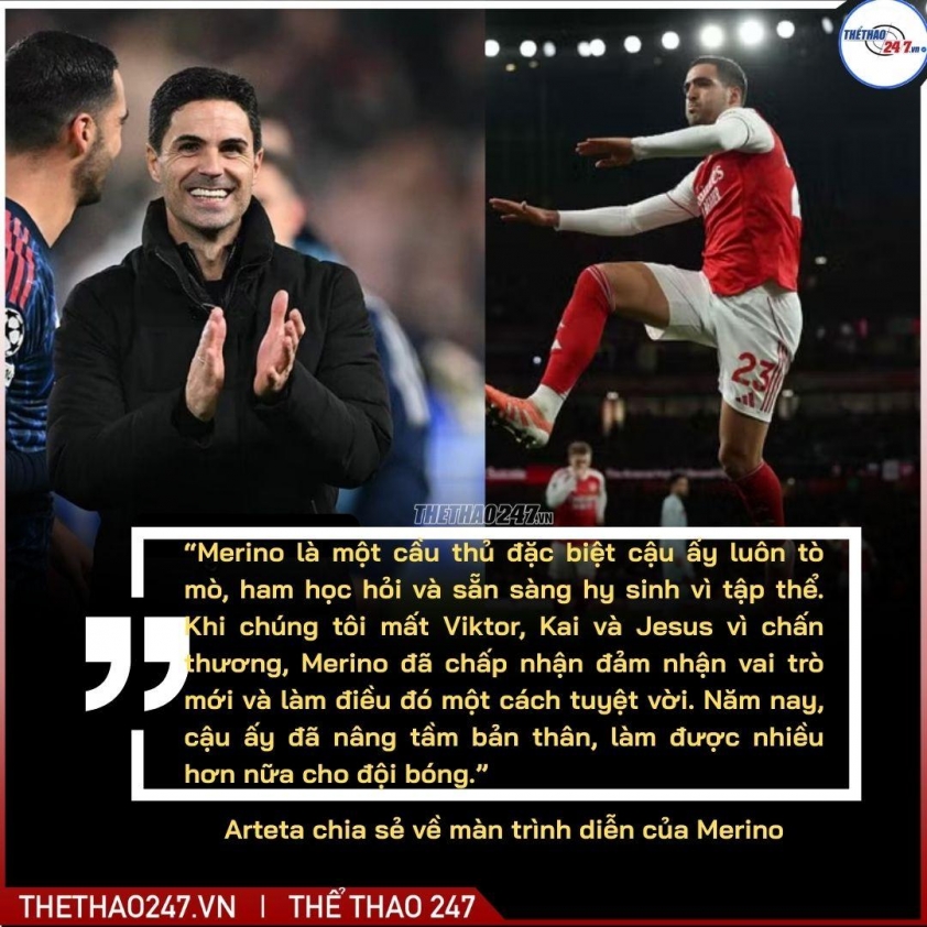 After the match, coach Mikel Arteta could not hide his pride in his compatriot: “Merino is a special player; he is always curious, eager to learn, and willing to sacrifice for the team. When we lost Viktor, Kai, and Jesus to injuries, Merino accepted a new role and performed it brilliantly. This year, he has elevated his game and contributed even more to the squad.”