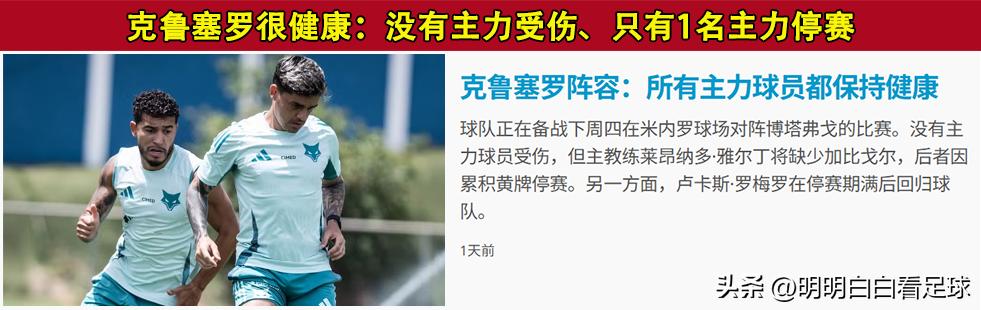 而克魯塞羅這邊,只有一名主力缺席,就是因停賽缺陣的加比球,其他球員皆健康。