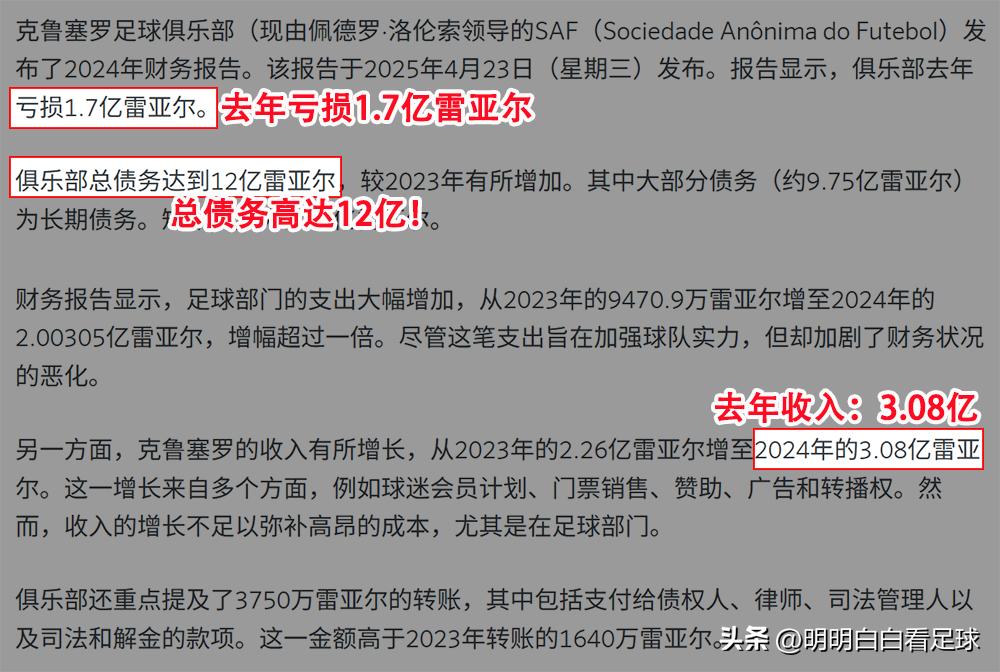 根據克魯塞羅官方報告,他們去年總共虧損了1.7億雷亞爾。