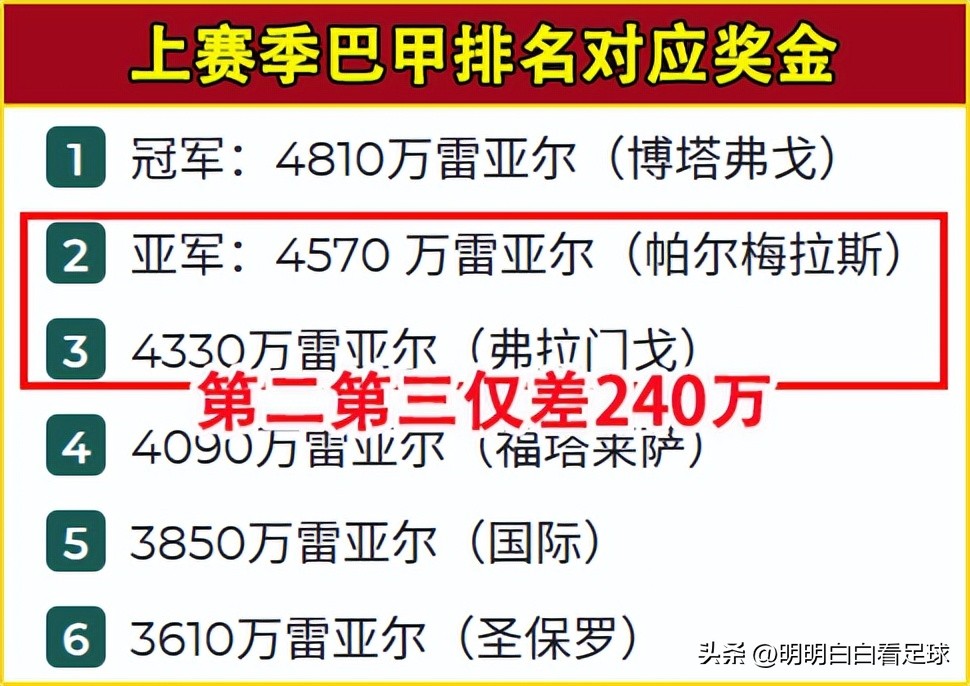 下圖是去年巴甲排名所帶來的收入情況,即使克魯塞羅能逆襲到巴甲第二,也只多了兩百多萬雷亞爾,跟巴西杯完全無法相比。