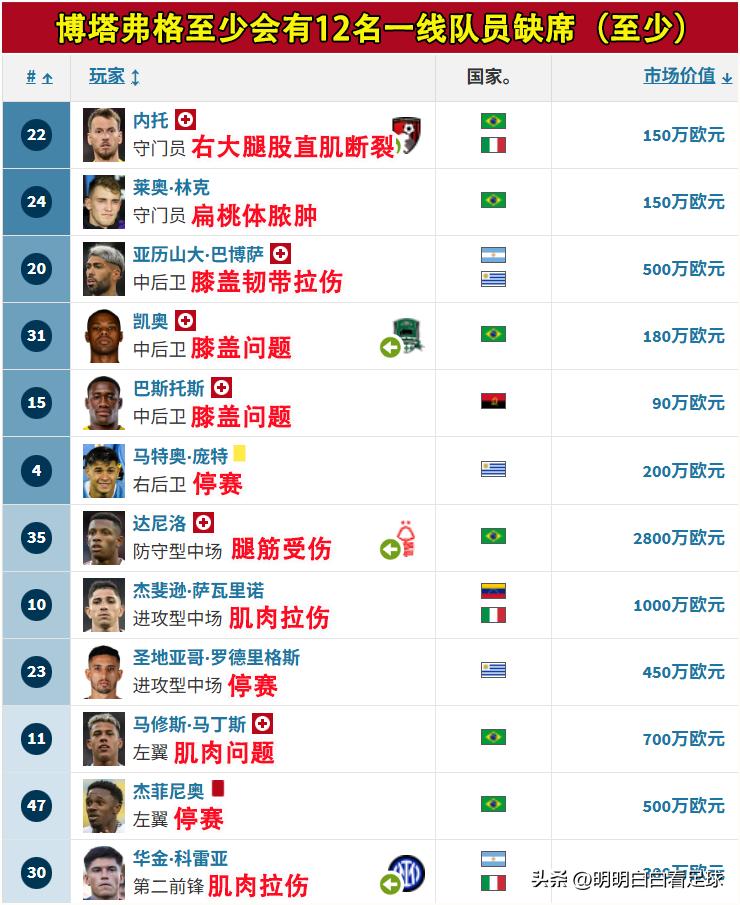 如果大家查看博塔弗戈的傷病名單,肯定會跟小酒一樣,略感震驚——今晚他們至少有12名球員缺陣!