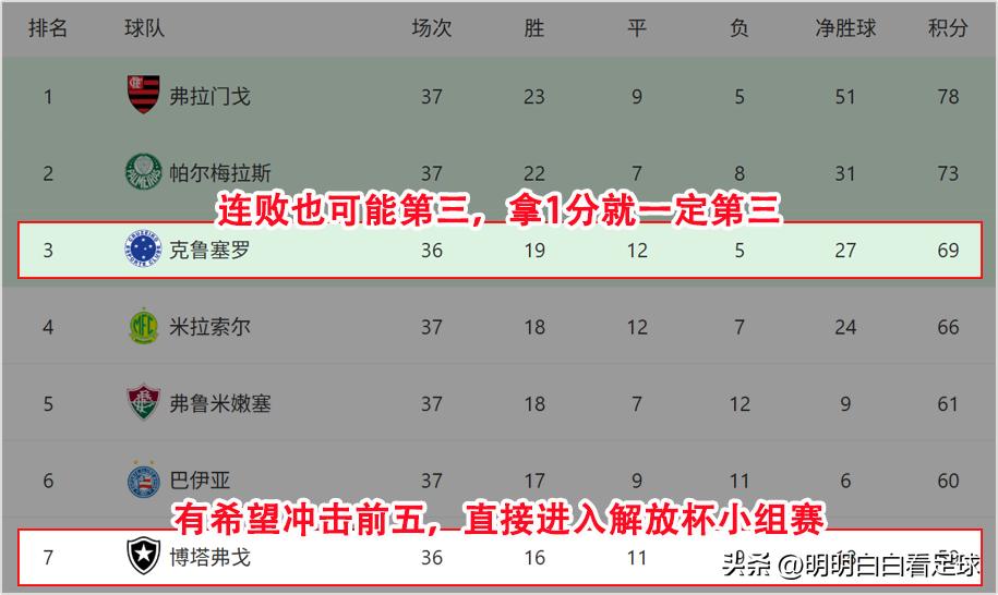 第三,克魯塞羅已鎖定一席解放者杯小組賽資格(前五名即可),而博塔弗戈仍須努力爭取;