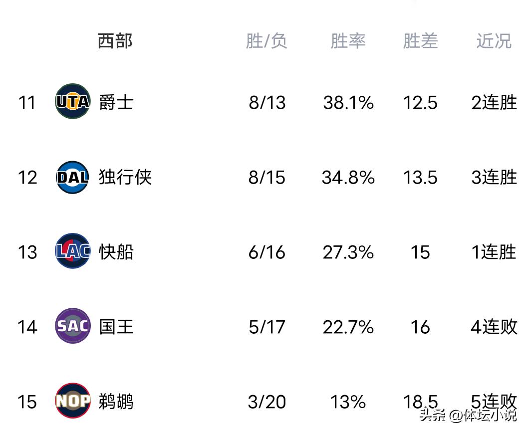 On December 6th Beijing time, the NBA regular season continued. Yesterday saw several thrilling games conclude: the weakened Warriors lost 98-99 to a last-second shot by the 76ers; the Jazz came from behind to beat the Nets 123-110; the Lakers nailed a buzzer-beating three-pointer to edge out the Raptors 123-120; and the Timberwolves powered through the fourth quarter to defeat the Pelicans 125-116. Consequently, the updated standings place the Lakers second, the Timberwolves with a four-game winning streak in sixth, the Warriors suffering a two-game losing streak at eighth, and the Pelicans enduring a five-game skid at the bottom!