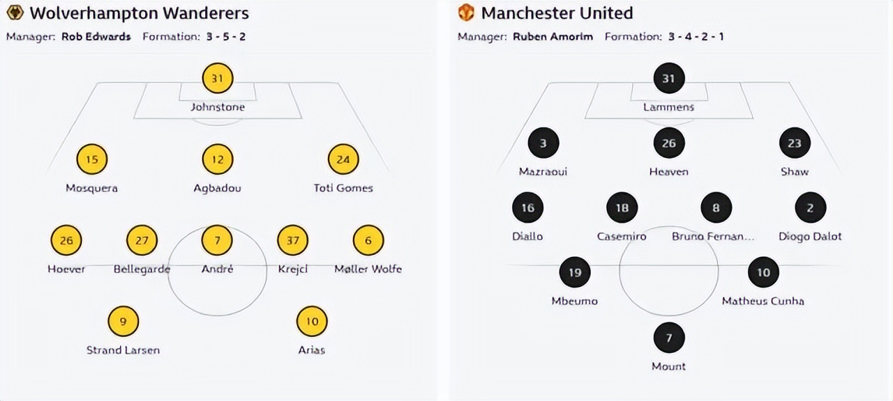 阿莫林對前鋒線做出調整,齊爾克澤被替換下場,反戈舊主的庫尼亞擔任中鋒,搭配梅森·芒特與姆貝莫,阿馬德·迪亞洛回歸右邊翼衛位置,馬茲拉維則取代萊尼·約羅客串中後衛。