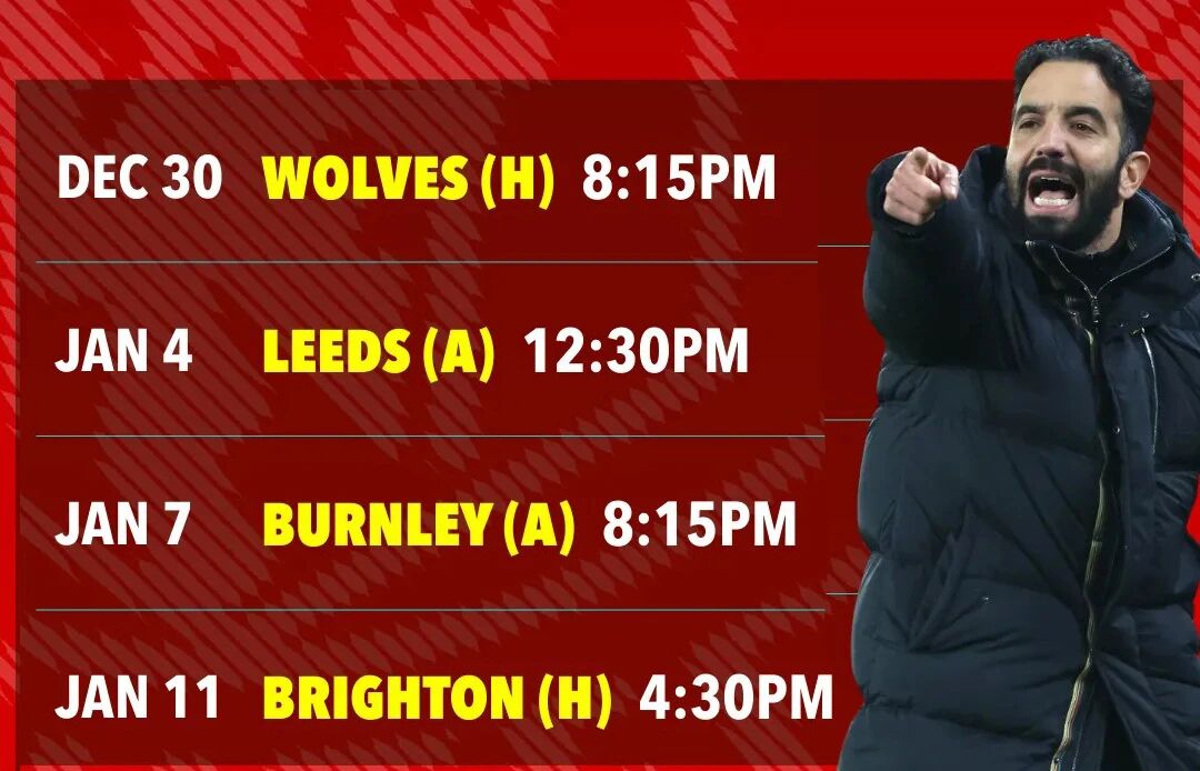 換言之,接下來三場比賽中,曼聯的對手均排在積分榜最後五名,這是阿莫林執教以來首次衝擊四連勝的絕佳契機!若加上足總盃第三輪主場迎戰排名第13的布萊頓,在1月中旬與曼城的同城德比前,球隊有望在各項賽事中連勝五場,讓球迷過個好年。