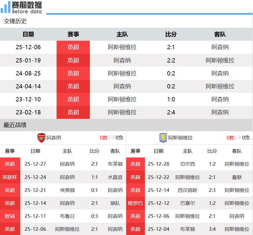 雙方近6次交鋒,阿森納取得2勝1平3負,處於劣勢。