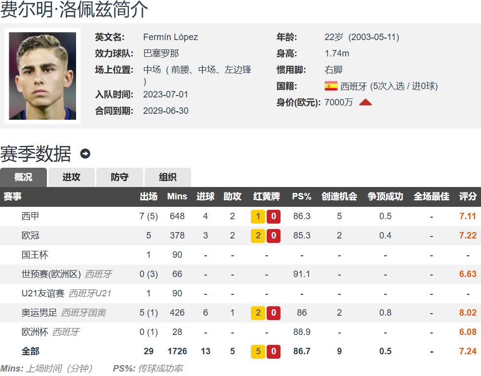費爾明現年22歲,身高1.74米,慣用右腳,主打前腰位置,德轉估價7000萬歐元,合約至2029年,本賽季西甲出戰12場攻入4球並有2次助攻,歐冠5場比賽貢獻3球2助攻,效率極高。