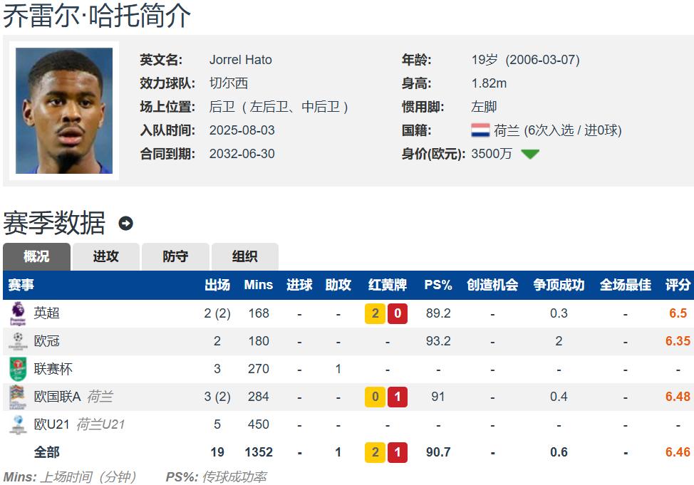 哈托現年19歲,身高1.82米,慣用左腳,主打左後衛位置,德轉估價3500萬歐元,合約至2032年,本賽季加盟切爾西後,英超出場4次,歐冠出場2次,聯賽杯出場3次,並送出1次助攻。