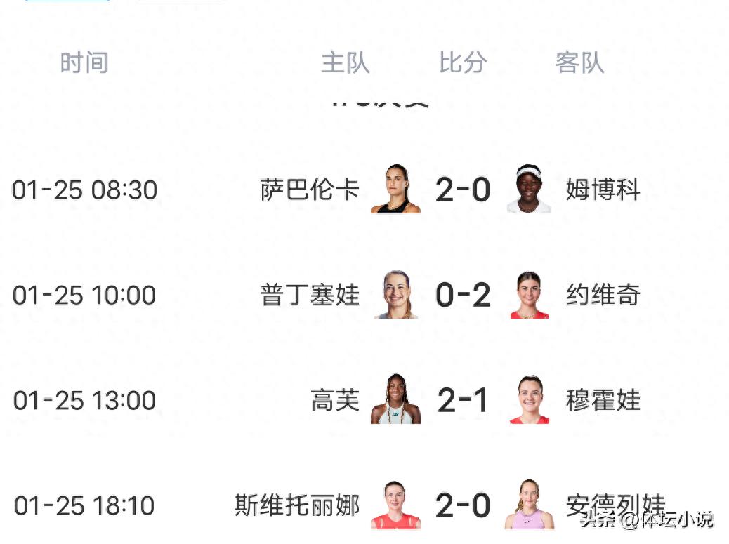 On January 26th Beijing time, the fourth round of the Australian Open women's singles kicked off. Yesterday, four matches wrapped up: Sabalenka won 2-0 over Mboko, Jovic triumphed 2-0 against Potapova, Gauff took a 2-1 victory over Muchova, and Svitolina shocked everyone by defeating No. 8 seed Mirra Andreeva 2-0. Thus, the tournament’s women's quarterfinals feature Sabalenka, Jovic, Gauff, and Svitolina!