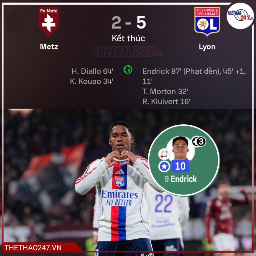In the match against Metz, Endrick demonstrated sharpness by scoring three goals and registering six shots on target, the highest number by a Lyon player in Ligue 1 since Opta began tracking data in the 2006–07 season, matching Alexandre Lacazette’s record against Monaco in 2016.