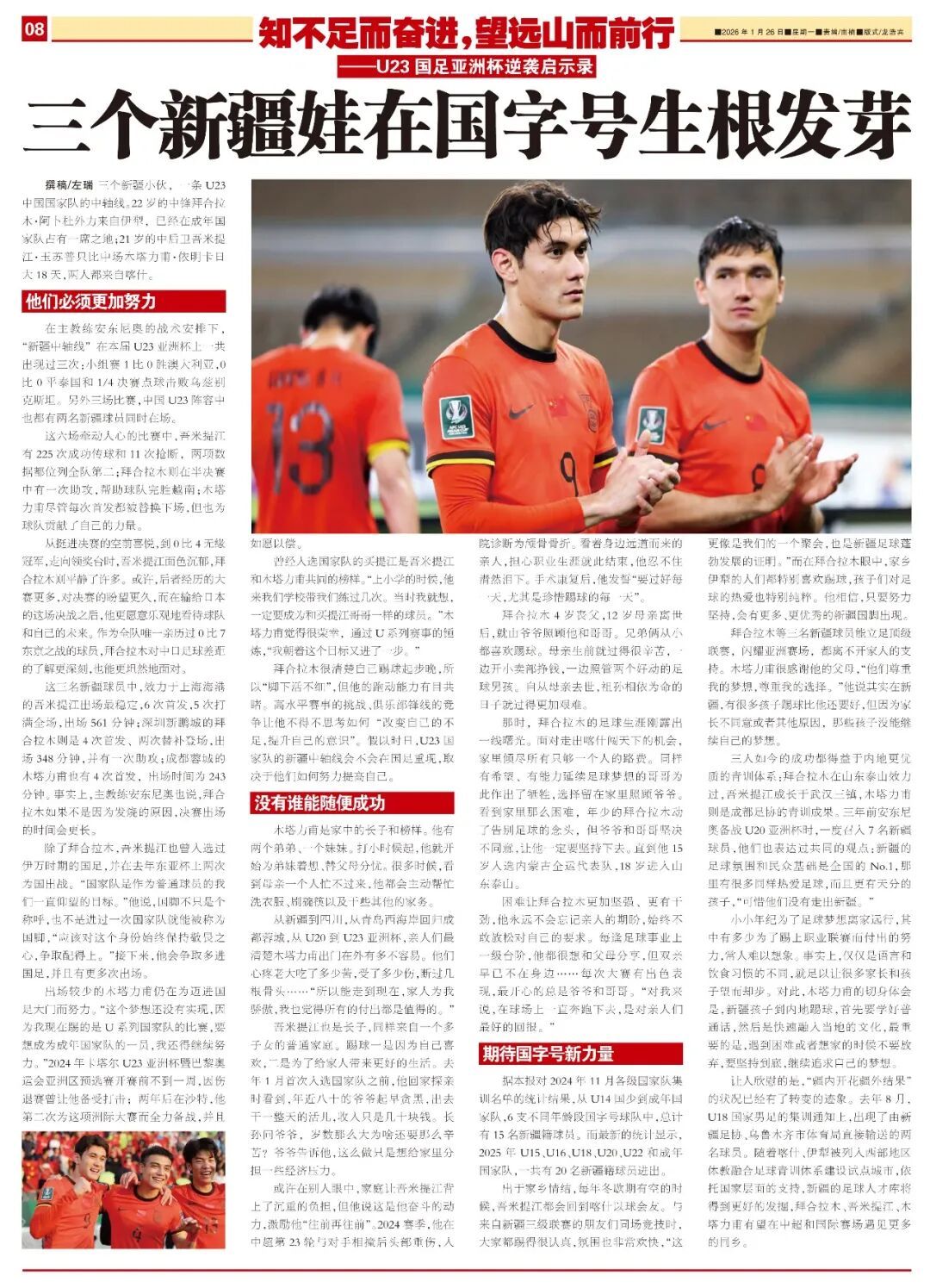 Written by Zuo Rui Three young men from Xinjiang coincidentally cover the defensive, midfield, and attacking lines of the U23 national team: 22-year-old striker Baihalamu Abduwali from Ili has previously earned a place in the senior national squad; 21-year-old center-back Wumitijiang Yusupu is just 18 days older than midfielder Mutalifu Yimingkar, both hailing from Kashgar.