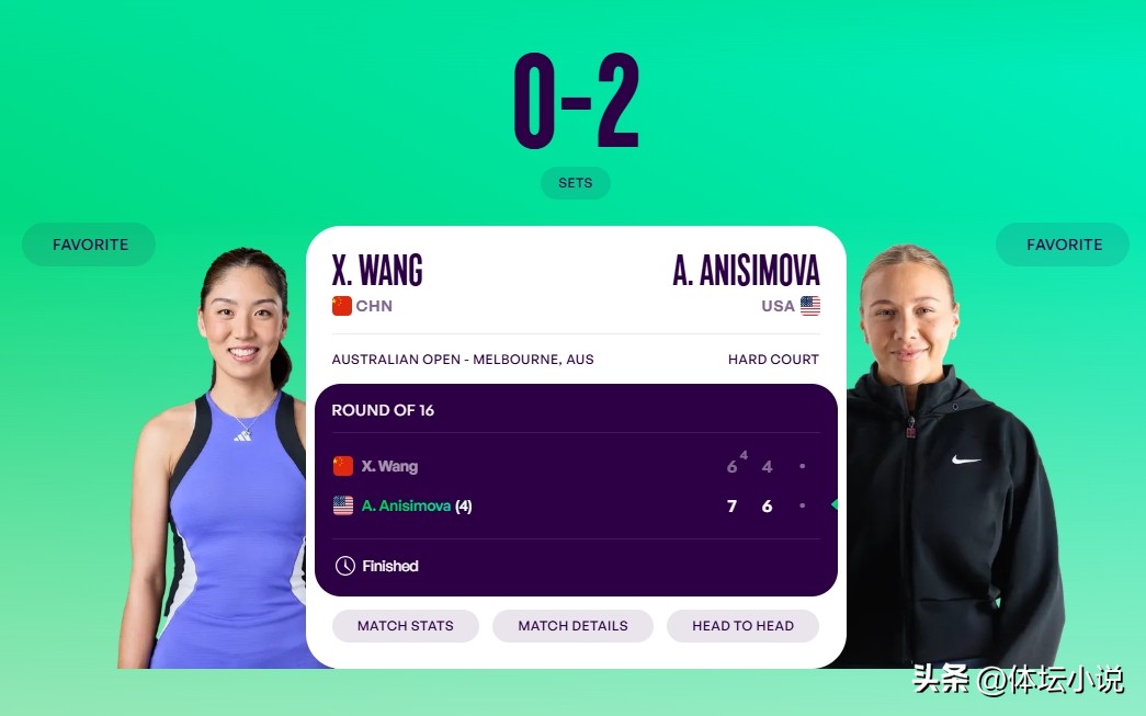 In the second set, Wang Xinyu clearly couldn’t keep up with her opponent’s pace. Losing the first set seemed to dent her momentum. She quickly fell behind 1-3 and even requested a medical timeout. Later, she trailed 2-4 and then 3-5. Although she fought back to 4-5, Anisimova exploded in the tenth game to clinch the set 6-4. The final score was 2-0 in favor of Anisimova, who advanced to the quarterfinals. This marked her third consecutive Grand Slam quarterfinal, demonstrating remarkable consistency!