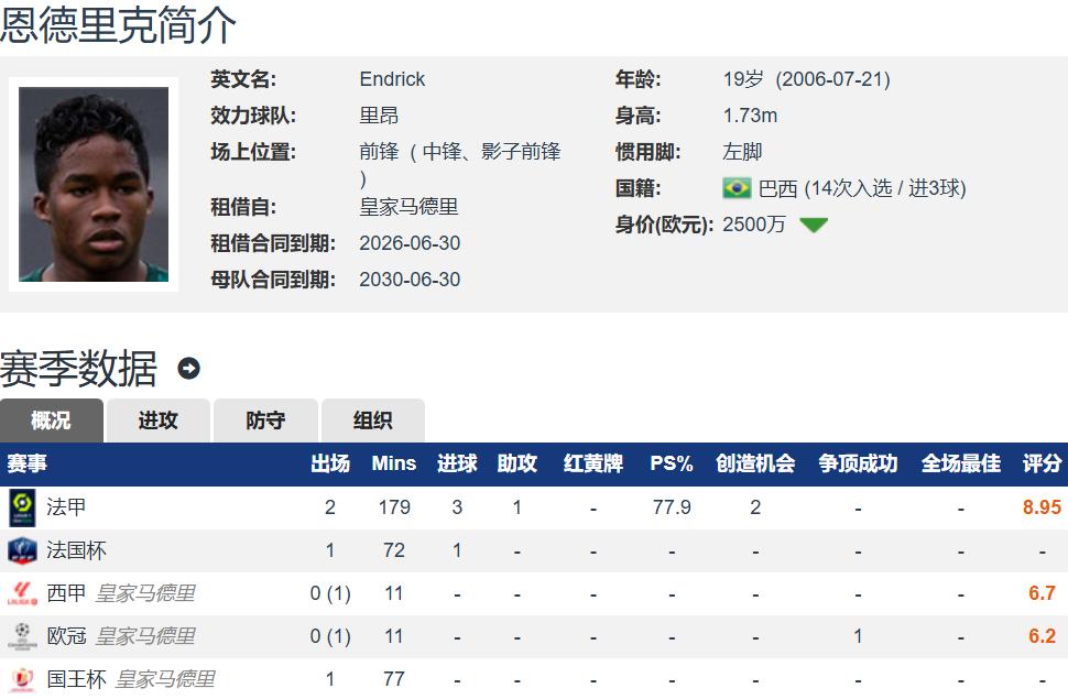 In this round of Ligue 1, Lyon won 5-2 away against Lens! Endrick, loaned from Real Madrid in the winter transfer window, started the game and delivered an outstanding performance with six shots, all on target, scoring his first career hat-trick. After the match, the media awarded Endrick a perfect 10 out of 10.