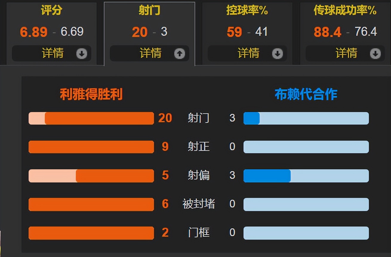 整場比賽中,利雅得勝利控球率達59%,共射門20次,其中9次射正;布賴代合作僅有3次射門且無射正。如此一面倒的比賽中,C羅7次射門為全場最高,射正2次,但未能得分。