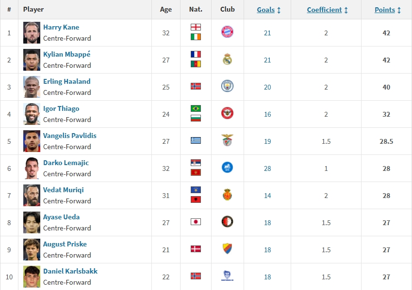 The latest standings for the 2026 European Golden Shoe are as follows: