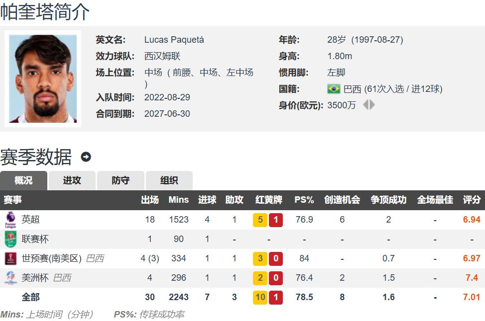 Now 28 years old, Paqueta is in the prime years for a modern footballer. Standing 1.80 meters tall and left-footed, he primarily plays as an attacking midfielder but can also operate in central midfield and left midfield. His current contract runs until 2027. This season in the Premier League, he has started all 18 appearances, scoring 4 goals and providing 1 assist; in the League Cup, he played once and scored once.