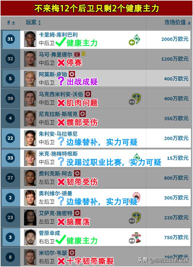 這代表雖然他們有12名專業後衛,但可能只有5名可用,其中一名中衛施梅特根斯還是從二隊召上來湊數,沒有任何職業級比賽經驗,真正健康的主力後衛只剩下2名。