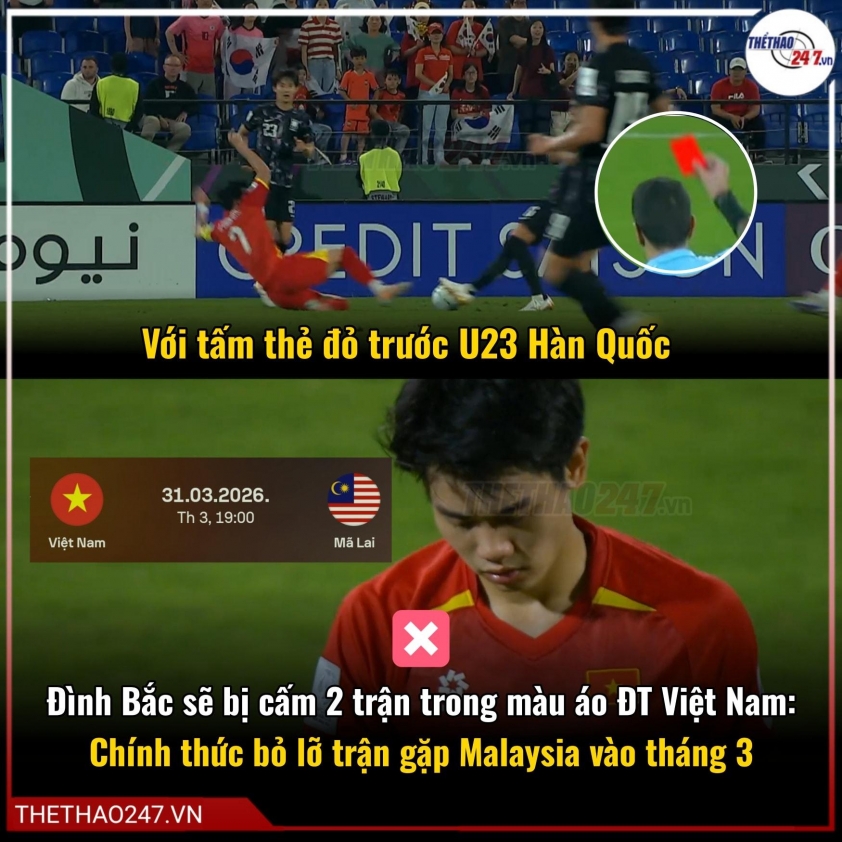 Since he is overage to participate in the 2028 U23 Asian Championship, this suspension will apply to official matches of the national team, meaning Đình Bắc will definitely miss the match against Malaysia. Even if called up by coach Kim Sang Sik, he can only train with the team but cannot be registered to play.