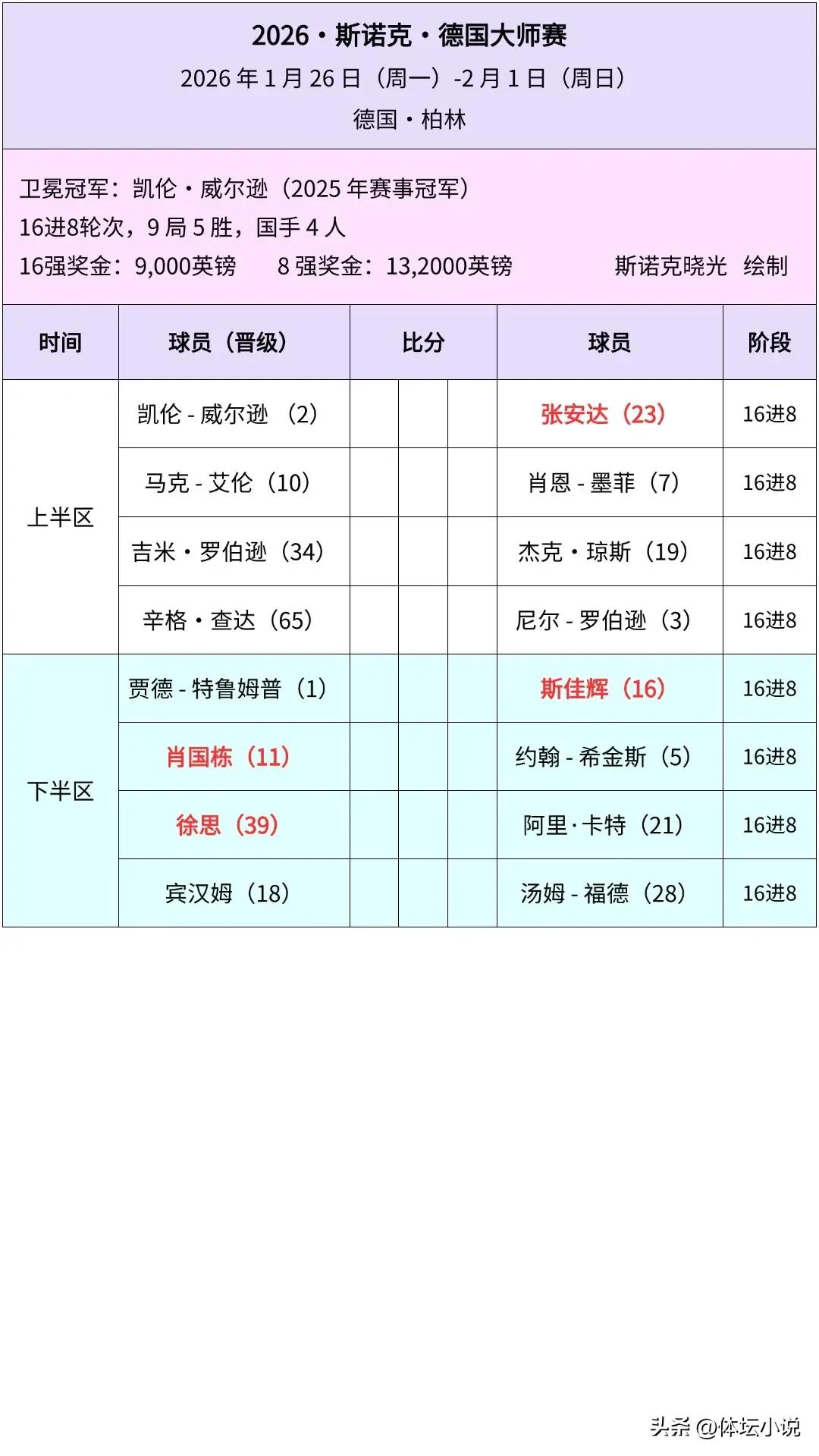 In other matches, Xiao Guodong powered past Lisowski 5-1, Pang Junxu was defeated 2-5 by Australian cannon Robbo, Gao Yang lost 3-5 to Mark Allen, Si Jiahui battled hard to edge Gilbert 5-4 in a 9-frame thriller, and Zhang Anda crushed Hawkins 5-2. The last 16 matchups are as follows!