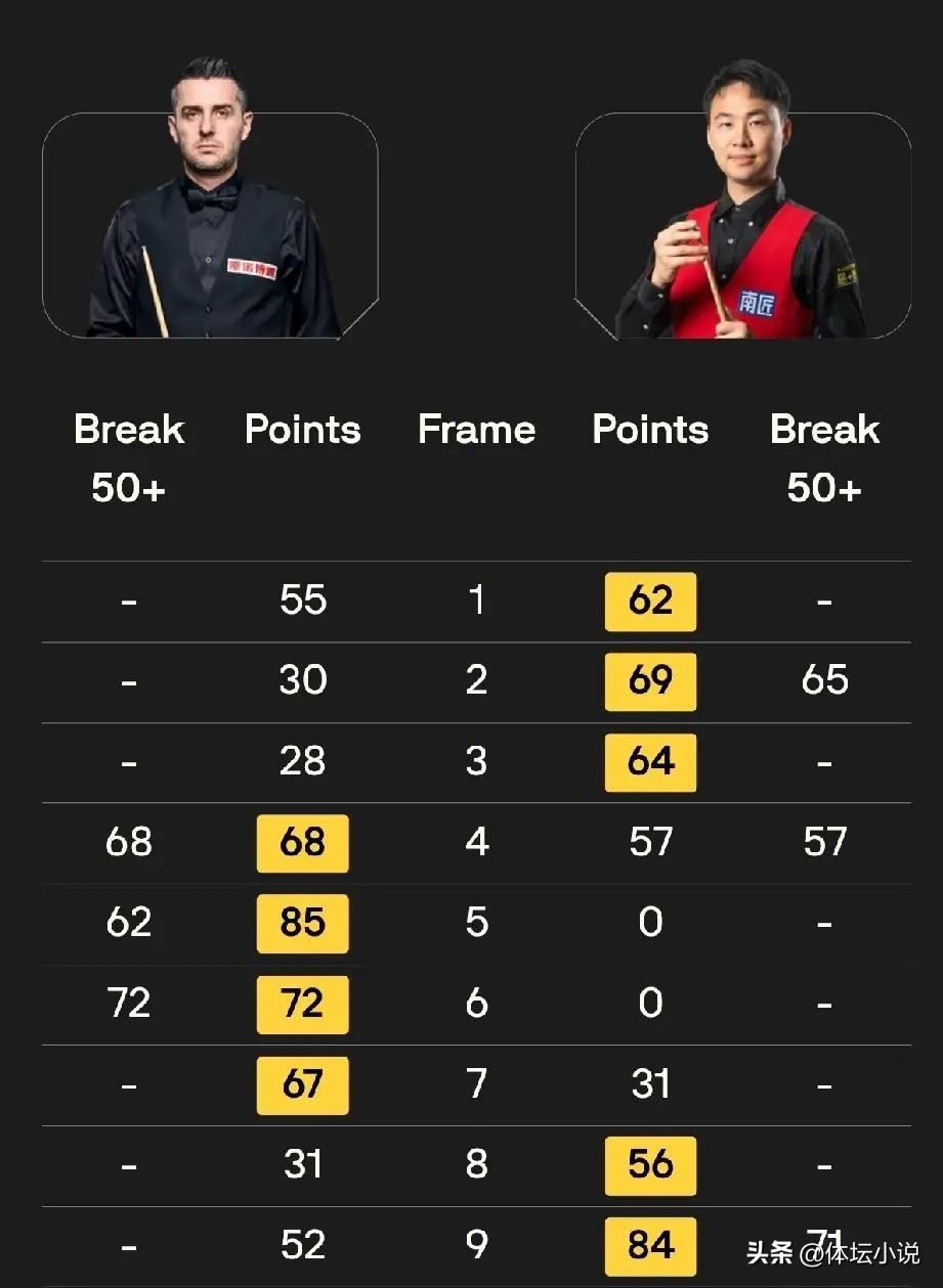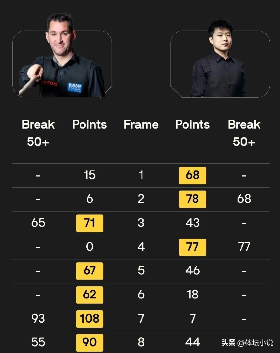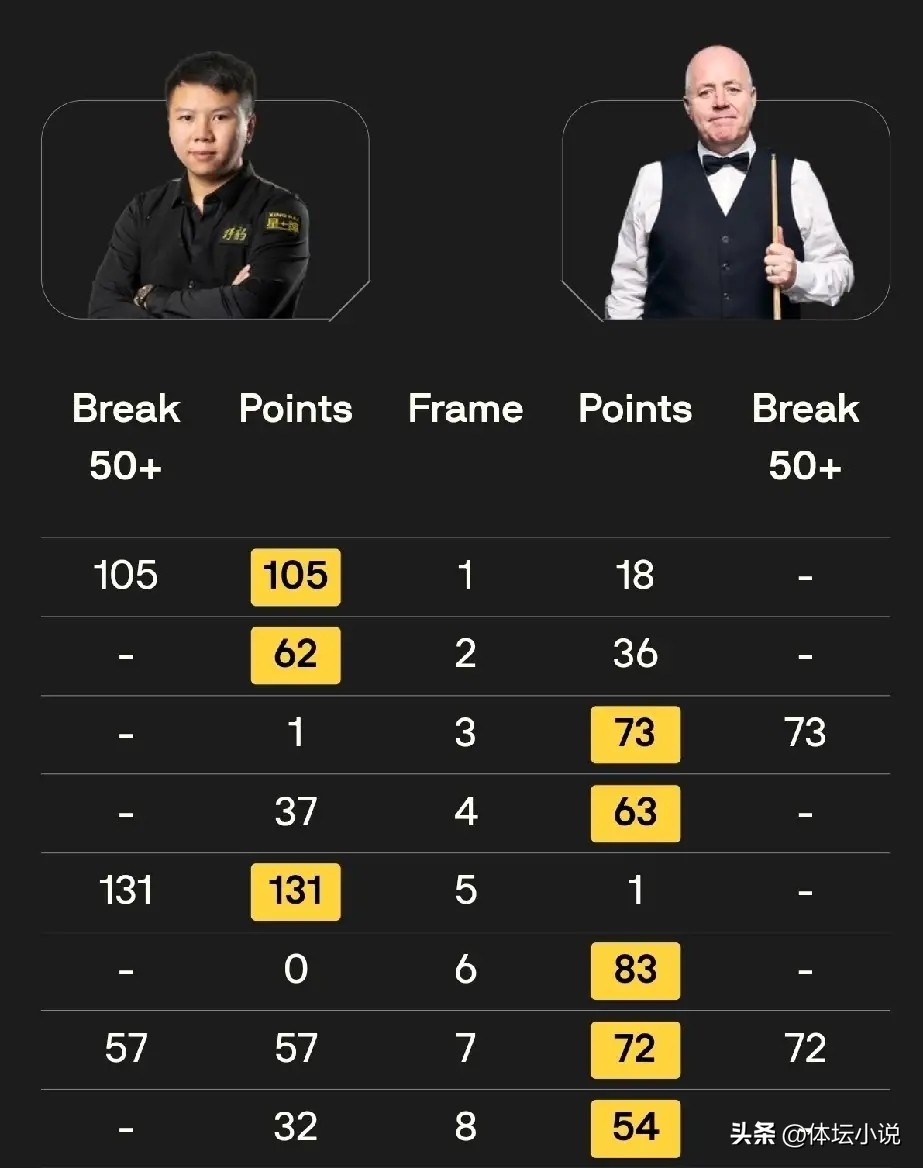 Zhou Yuelong versus Higgins. Facing the experienced Higgins, who recently reached the Masters final and was in strong form, Zhou Yuelong started brilliantly with a 2-0 lead combining attack and defense. Higgins responded strongly, leveling at 2-2. In the fifth frame, Zhou blasted a century break of 131 to lead 3-2 again. Higgins fought back to tie 3-3 with an 83-0 frame win. Crucially, in frame seven, Zhou squandered a good chance with a key error after a 57 break, allowing Higgins to complete a dramatic 72-point turnaround to lead 4-3. Higgins maintained his momentum to take frame eight 54-32, completing a 5-3 comeback victory over Zhou Yuelong!