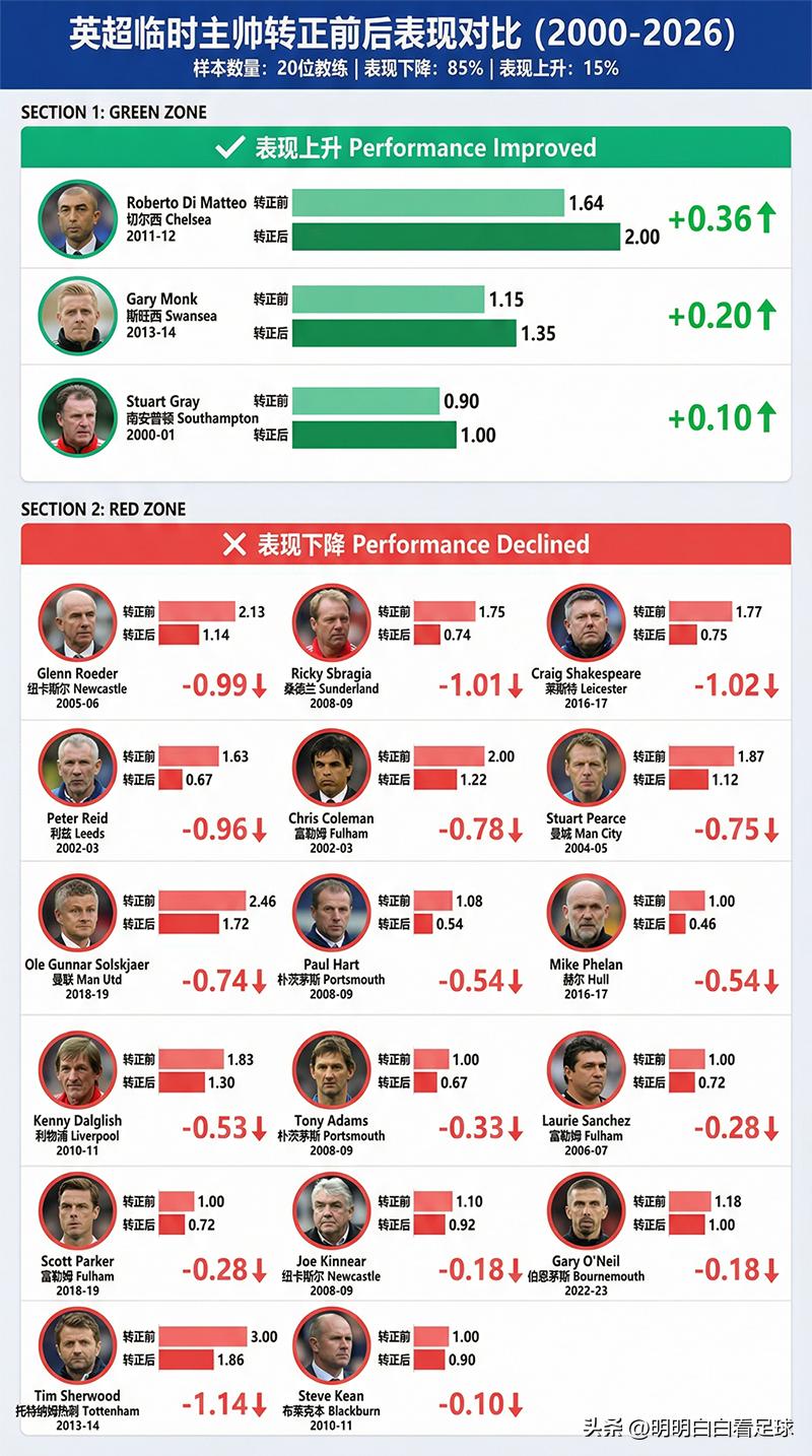 Since 2000, the Premier League has had 20 interim coaches made permanent, and only 3 performed better after the promotion; the other 17 all performed worse.