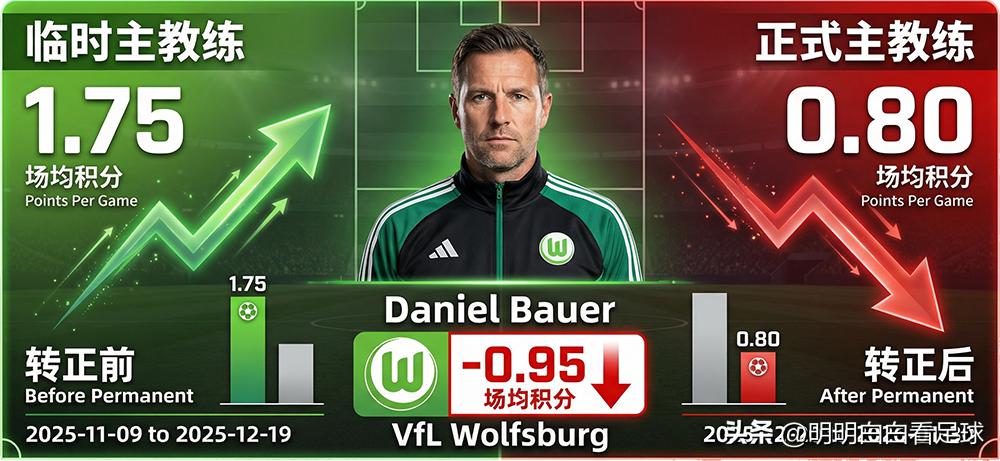 As for Wolfsburg’s current coach,before renewal, he averaged 1.75 points per game; after renewal, only 0.80 points per game—a drop of more than half!Clearly, that’s not a good sign.