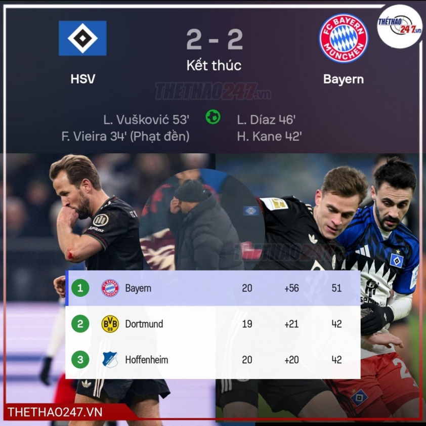 With the 2-2 draw, Hamburg climbed to 13th place and can be satisfied with the result against the league leaders. Meanwhile, Bayern remains top but has opened the door for Borussia Dortmund to reduce the title gap to 9 points.