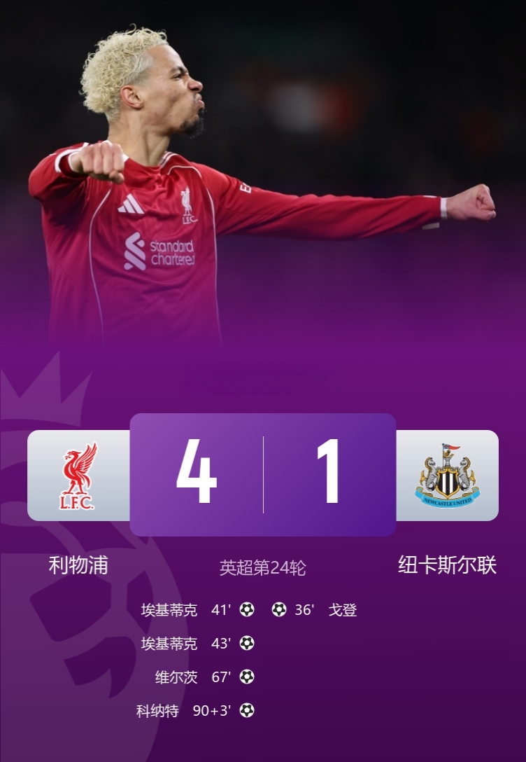 Liverpool came from behind to beat Newcastle 4-1, ending a five-match winless run. In this game, Liverpool showcased a Bundesliga core: Ekittik scored twice, Wirtz contributed a goal and an assist, and Salah and Wirtz finally connected, with Salah assisting Wirtz. This marked the beginning of harmony in Liverpool’s dressing room. Konate also scored. The three goal scorers, a forward, midfielder, and defender, all hail from the Bundesliga, forming Liverpool’s German spine.