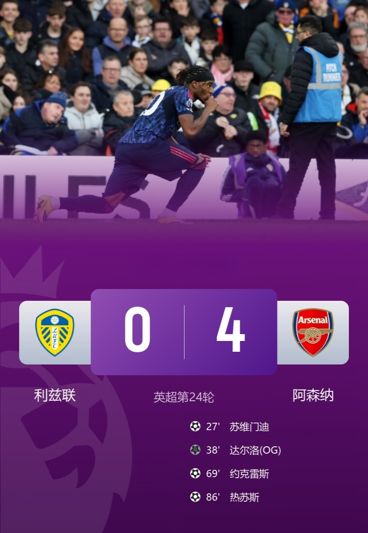 League leaders Arsenal ended a three-game winless streak with a commanding 4-0 away victory over Leeds United, solidifying their top spot while watching Manchester City and Tottenham face off. Arsenal played with great ease. With star player Saka absent, Maduake sharpened Arsenal’s attack, providing an assist and forcing an own goal. Finally, someone passed to Yorekles, as the Swedish striker broke his scoring drought. Jesus scored off the bench, and the sharp Arsenal returned to form in the Premier League.