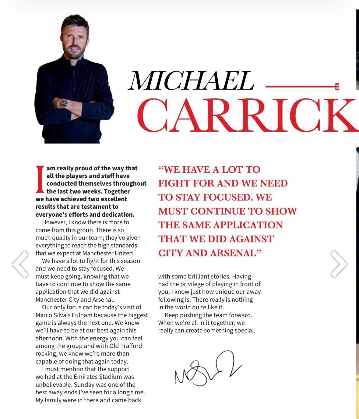 曼聯連勝兩場後排名英超第四,但切爾西和利物浦本輪勝出後暫時超越紅魔,卡里克和球隊必須在剩下的15場比賽中拿出好成績,才能確保重返歐冠。卡里克並未因連續擊敗強隊而自滿,他清楚馬爾科·席爾瓦帶領的富勒姆將帶來與瓜迪奧拉的曼城、阿爾特塔的阿森納截然不同的挑戰。