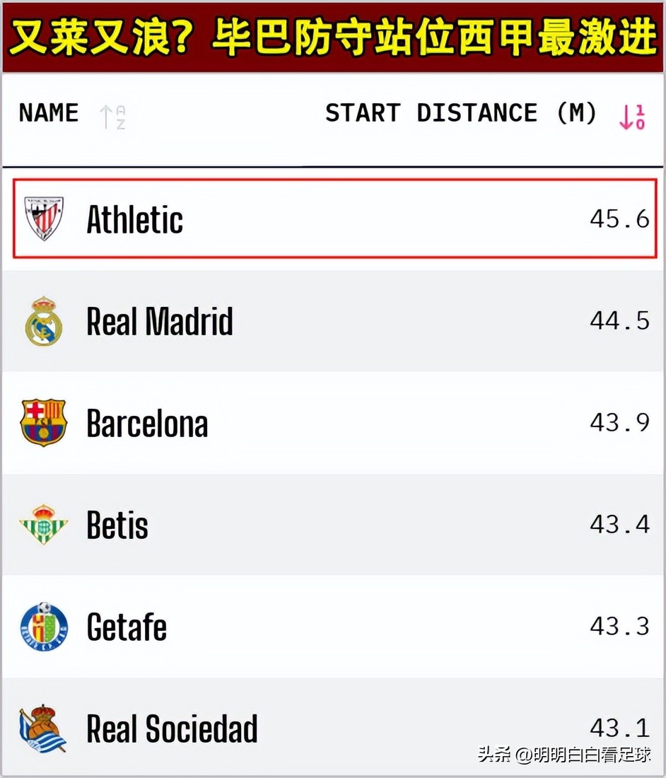 For example:Bilbao’s defensive line is positioned 45.6 meters from their own goal, the furthest in La Liga.