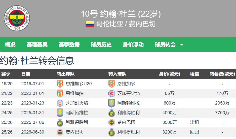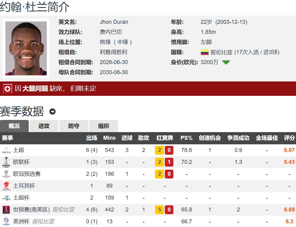 Duran is currently 22 years old, stands 1.85 meters tall, is a left-footed center forward, and is under contract with Riyadh Victory until 2030. Transfermarkt values him at €32 million. His recent stats for the last three clubs are as follows:Aston Villa: 78 appearances, 20 goals, 1 assist; Riyadh Victory: 18 appearances, 12 goals, 0 assists; Fenerbahçe: 21 appearances, 5 goals, 3 assists