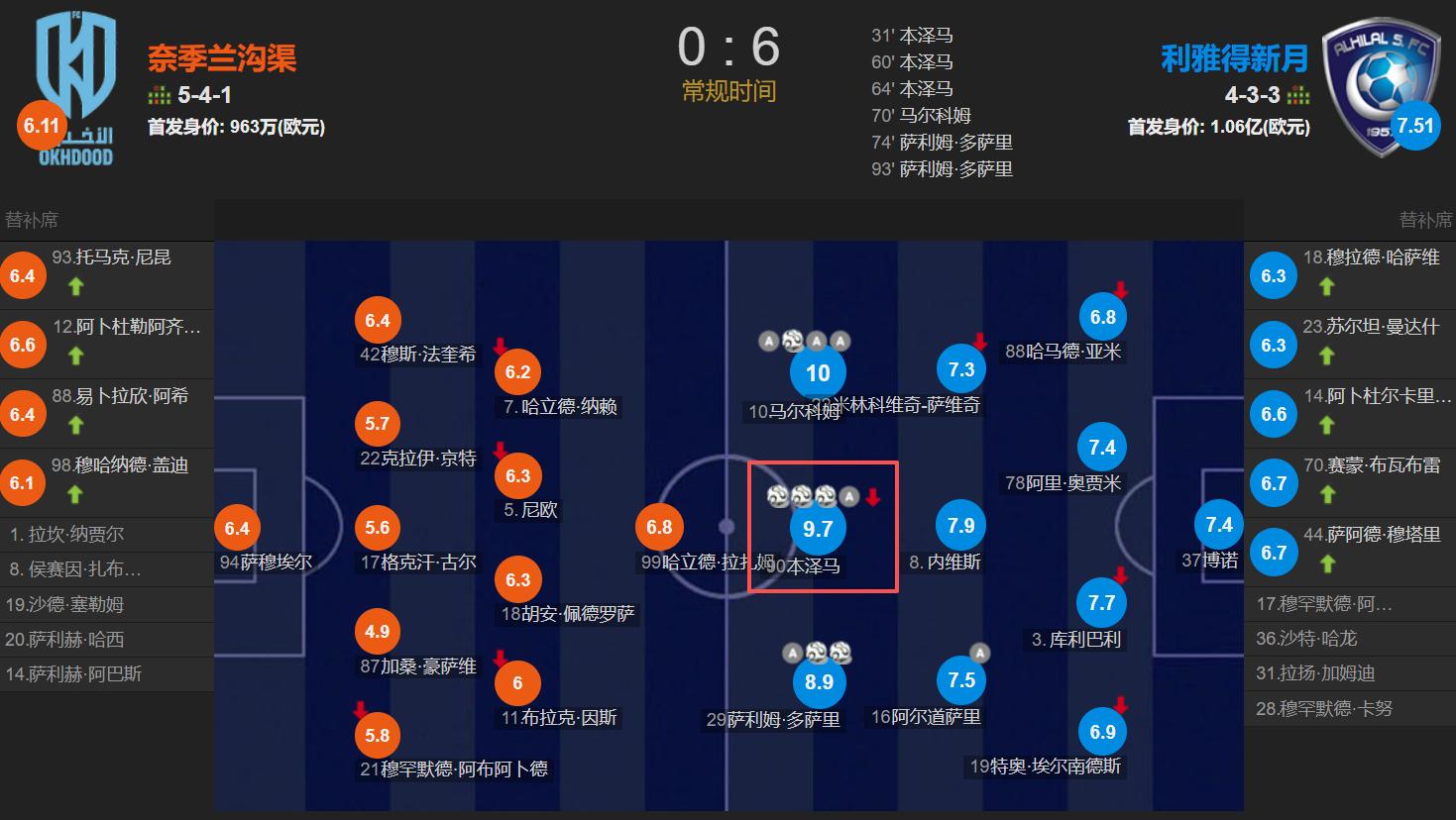 In this match, Benzema scored the team's first three goals, including one assisted by Malcolm. Benzema reciprocated by assisting Malcolm as well. After the game, Benzema, with 3 goals and 1 assist, received the highest rating of 9.7, while Malcolm earned a perfect 10 for his 3 assists and 1 goal. Benzema’s arrival, with his strong hold-up play and scoring ability, has fully activated Al Hilal’s two wings: left winger S. Dosari with 2 goals and 1 assist, and right winger Malcolm with 3 goals and 1 assist. This is a capability that Nunez completely lacks. The 38-year-old Benzema is clearly superior to the 26-year-old Nunez.