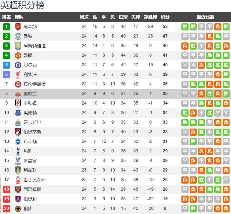 First:Team situationsAfter 24 rounds of the Premier League, Arsenal holds a record of 16 wins, 5 draws, and 3 losses, accumulating 53 points and ranking first, while Sunderland has 9 wins, 9 draws, and 6 losses with 36 points, placed eighth. In the last Premier League round, Arsenal secured a 4-0 away victory over Leeds United, ending a three-game winless streak in the league, and during the midweek League Cup, they won 1-0 at home against Chelsea to reach the final; Sunderland achieved a 3-0 home win over Burnley, showing stronger form at home than away.
