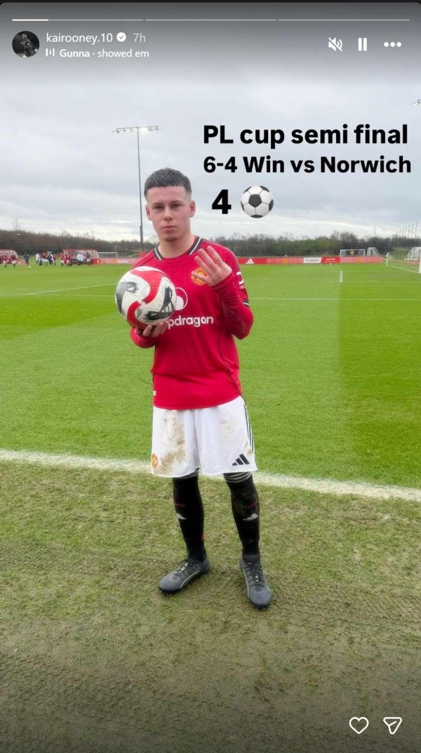 In the semi-final match of the Premier League Cup for the U16 category held last weekend, Kai Rooney delivered an outstanding performance, playing a key role in the youth team’s thrilling 6-4 victory over Norwich City. After the game, the 16-year-old forward excitedly posted a photo of the commemorative ball on Instagram, a reward for his hat-trick, expressing clear pride in his own performance.