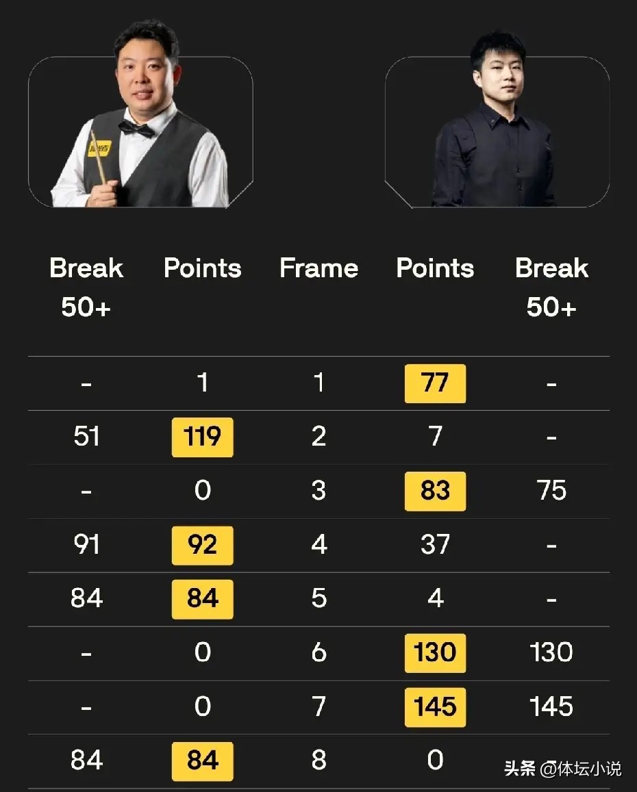 The first stage between the two has ended with intense competition, like a clash of titans. The match has been full of twists and turns, with the lead exchanging hands repeatedly, tied at 4-4. Zhang Anda scored four breaks over 50, while Zhao Xintong made two centuries including a high break of 145, likely securing the highest break prize. Both players are in fiery form, keeping the championship suspense alive!