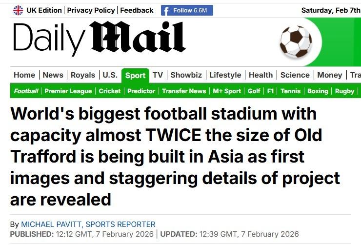 The Daily Mail reports that Vietnam has started building the world's largest stadium in Hanoi, seating 135,000 people, almost twice the size of Old Trafford, drawing interest from UK media.