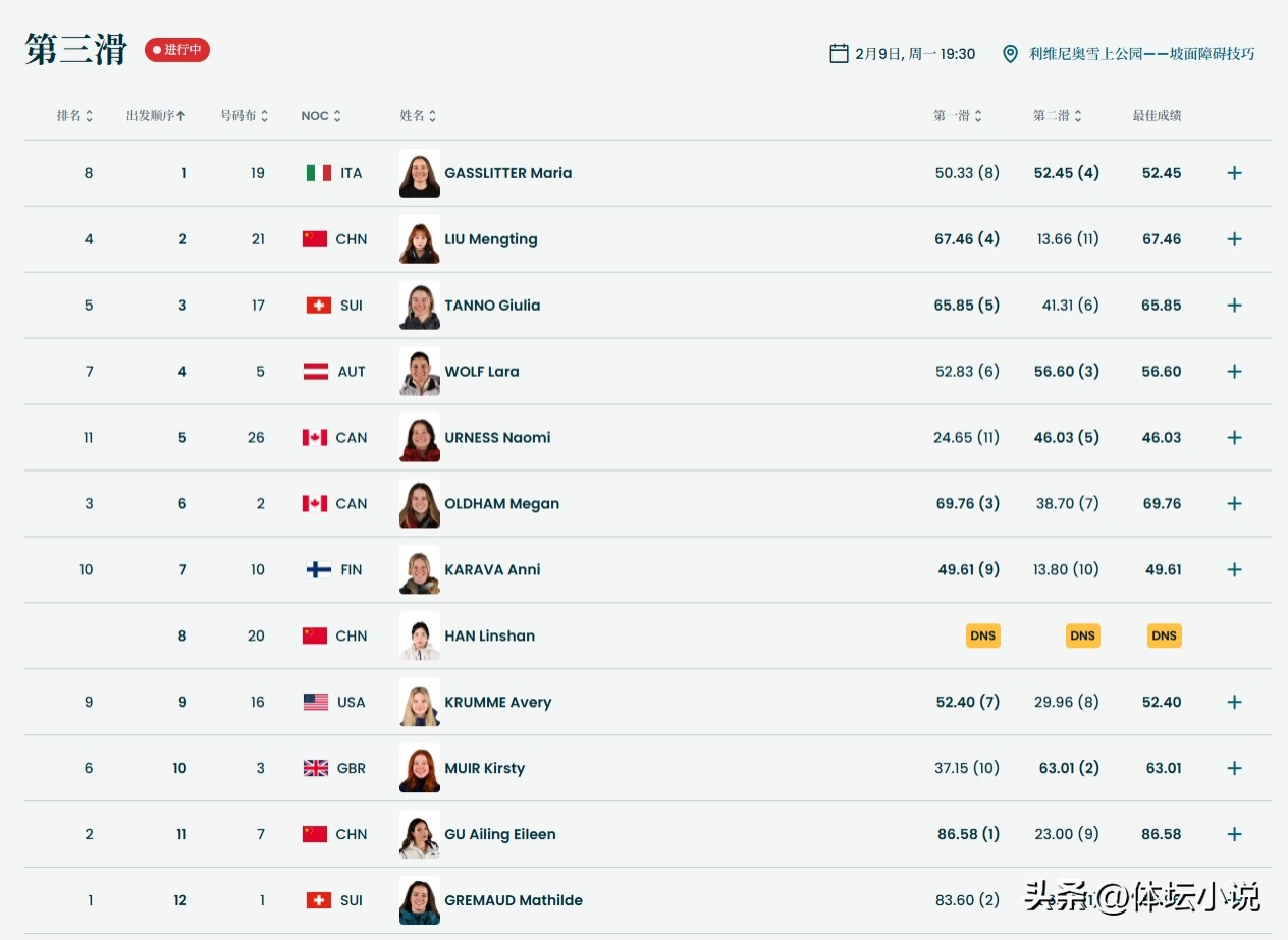 The competition in this event is extremely fierce. Our biggest rival is Swiss athlete Mathilde Gremaud, the reigning champion from the Beijing Winter Olympics, who is nearly flawless. Last time, Eileen Gu lost to her and took silver in this event. Slopestyle is not Gu’s strongest discipline, so expectations should be tempered. Interestingly, these two will face off again in the final, with Gu determined to claim the gold this time!