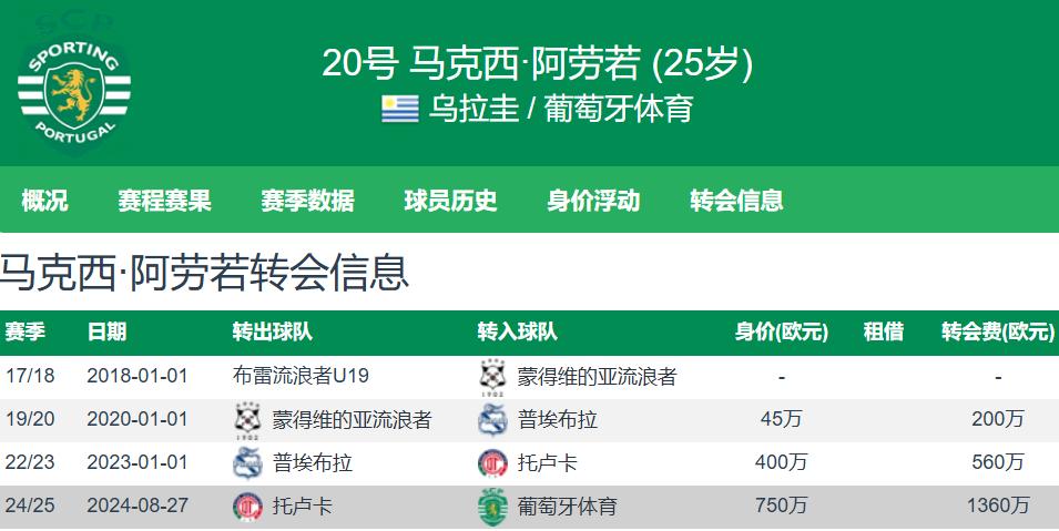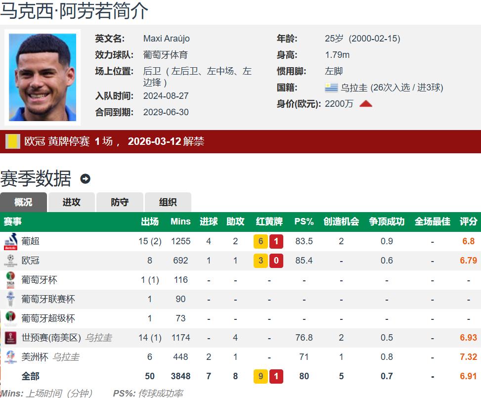 Currently 25 years old, standing 1.79 meters tall and left-footed, Maximiliano Araújo can play multiple positions on the left flank. His contract with Sporting CP runs until 2029. Transfermarkt estimates his value at €22 million. This season, he has featured in 29 games across all competitions, scoring 5 goals and assisting 3 times. He is a highly offensive left wing-back and a Uruguayan international, having earned 26 caps for the national team, contributing 3 goals and 9 assists.