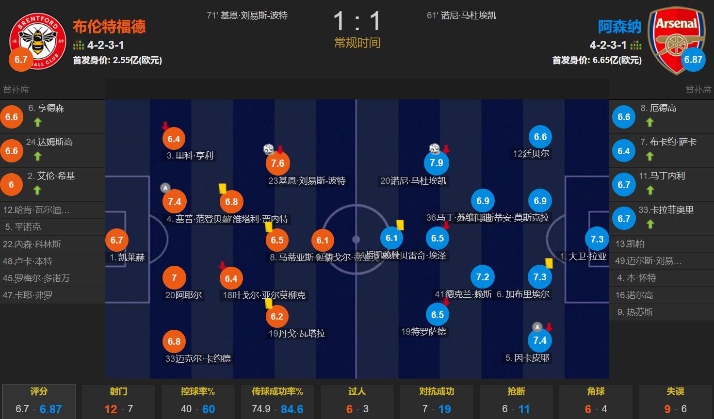 Ultimately, Arsenal drew 1-1 away at Brentford, maintaining a slim 4-point lead at the top, reigniting the Premier League title race; Brentford sits in seventh place.