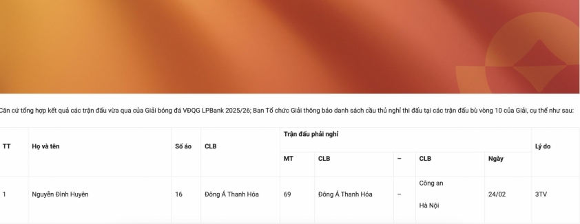 The difficulties persist for Thanh Hóa FC as they face the upcoming rescheduled match without another key player. Nguyễn Đình Huyên is suspended after receiving his third yellow card, making an already thin roster even more strained. The coaching staff has very limited rotation options and must rely heavily on the endurance of the eligible players.
