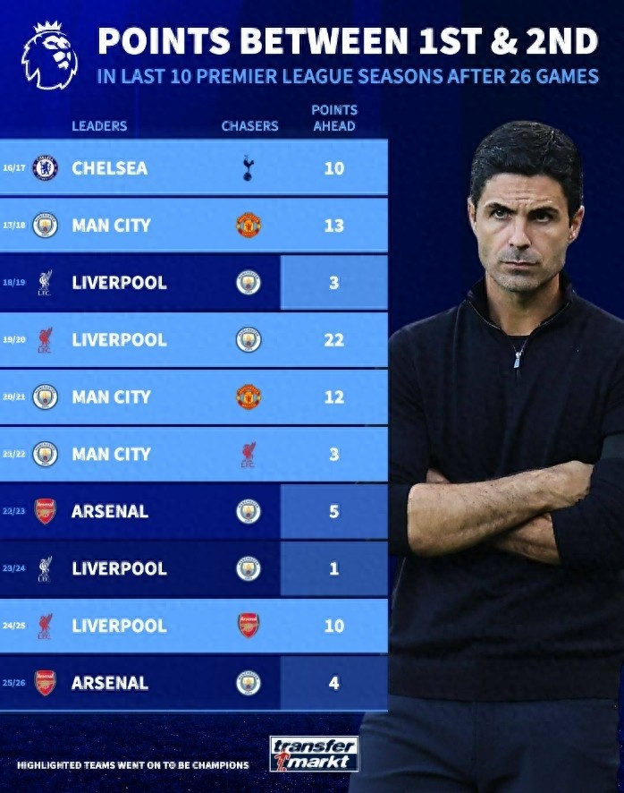 In response, Transfermarkt reviewed the point differences between the top two teams after 26 rounds in the Premier League over the past 10 seasons. Highlighted are the teams that eventually won the title. There have been 3 occasions when the leader lost the championship, including the 2022-23 season when Arsenal led Manchester City by 5 points but ultimately lost the title.