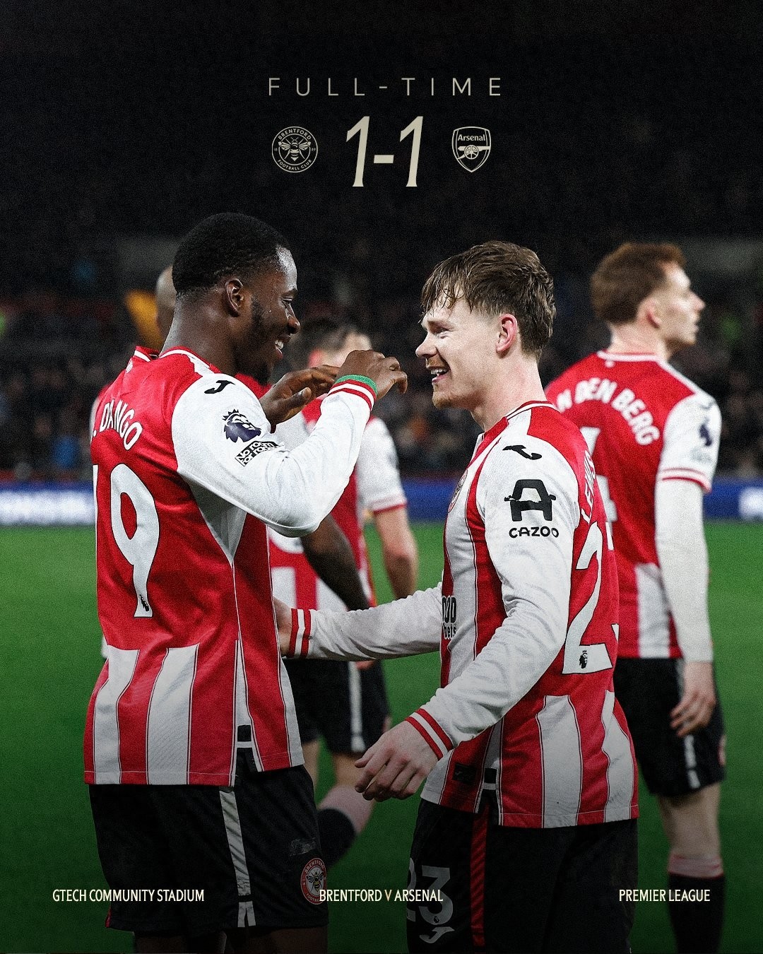 In the 26th round of the Premier League, Brentford dominated the game but drew 1-1 with Arsenal, narrowing Arsenal’s lead at the top of the table to just 4 points and reigniting the title race suspense.