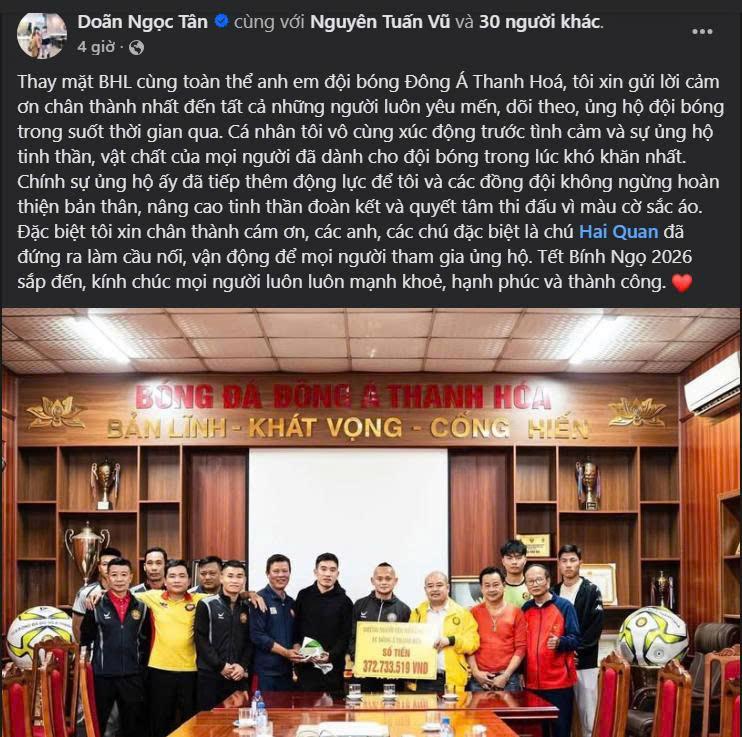 Beyond expressing general gratitude, Ngọc Tân specifically thanked those individuals who took the initiative to organize the fundraising, helping create this meaningful support. He also wished the fans good health and happiness in the new year – those who have always stood by the team in every circumstance.