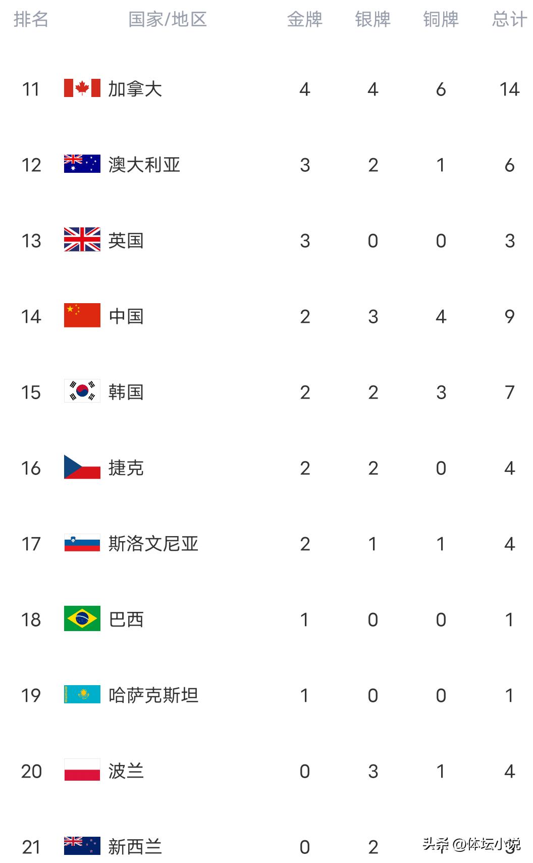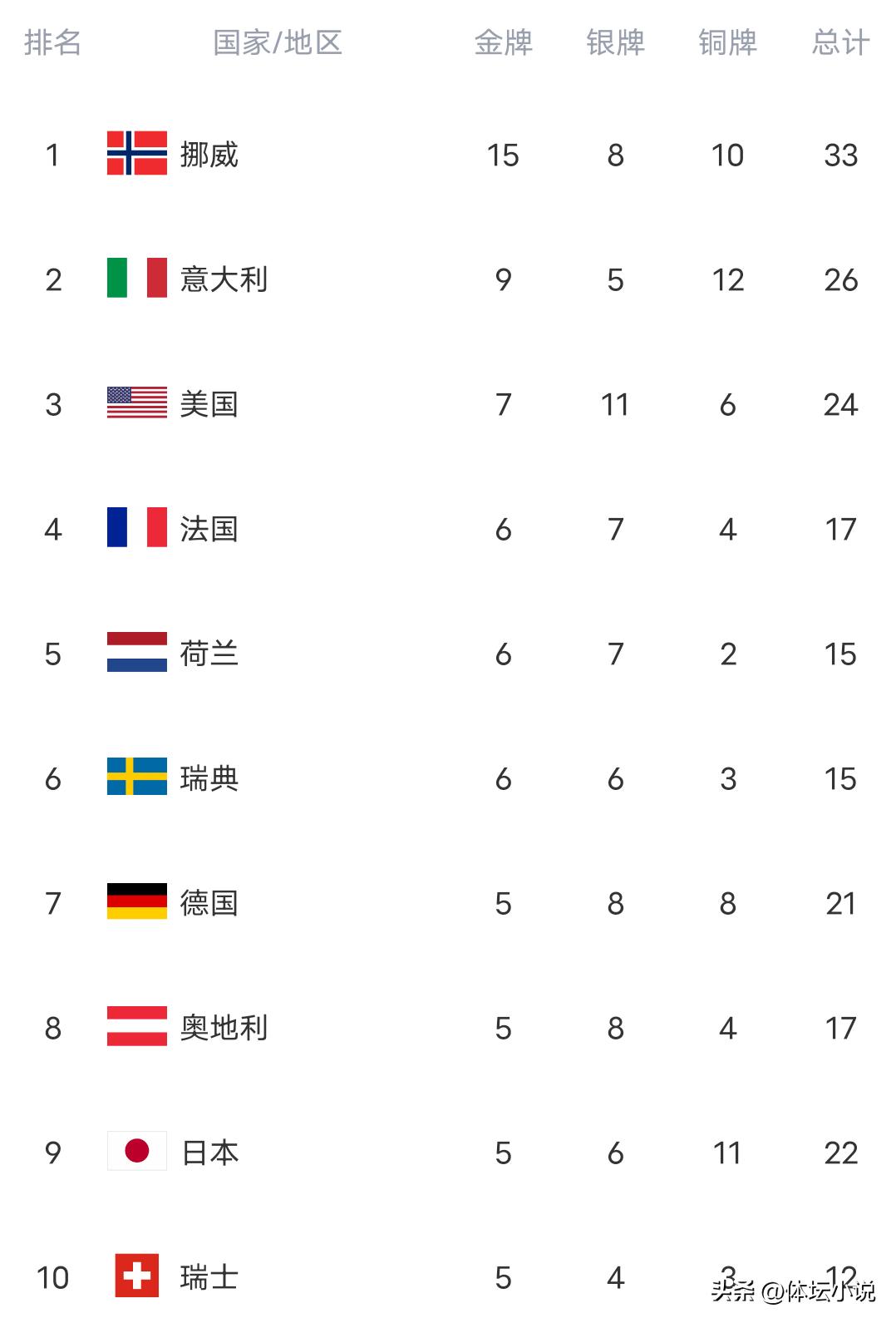 The latest gold medal standings have been updated: Norway leads with 15 gold medals, firmly holding the top spot. China’s explosive day with two gold medals in one day propelled them up five places to 14th, surpassing their longtime rival South Korea. It’s truly a satisfying and proud moment—well done!