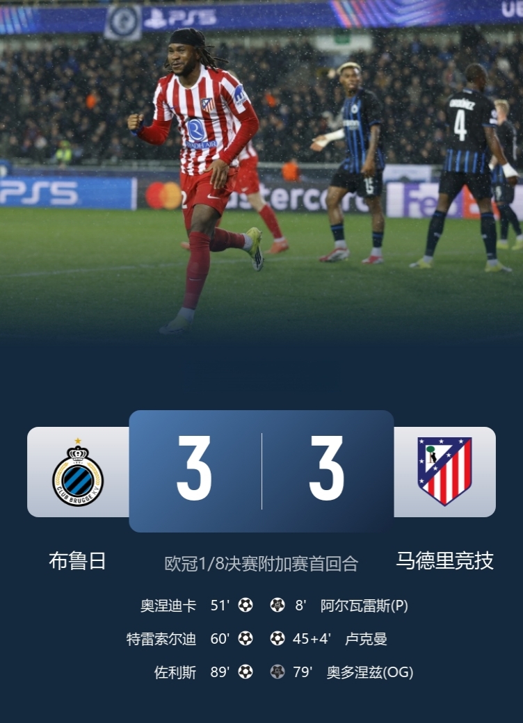 Club Brugge 3-3 Atlético MadridBarcelona’s aftereffects continue, with only one win in their last four games, including a 4-goal first half against them! Alvarez scored a penalty, and new signing Lukman found the net! Atlético drew a non-top-five league team, which was expected to be an easy match but turned into a tough challenge. For Los Colchoneros, the difficulty was high. A draw away at Club Brugge counts as a minor upset!