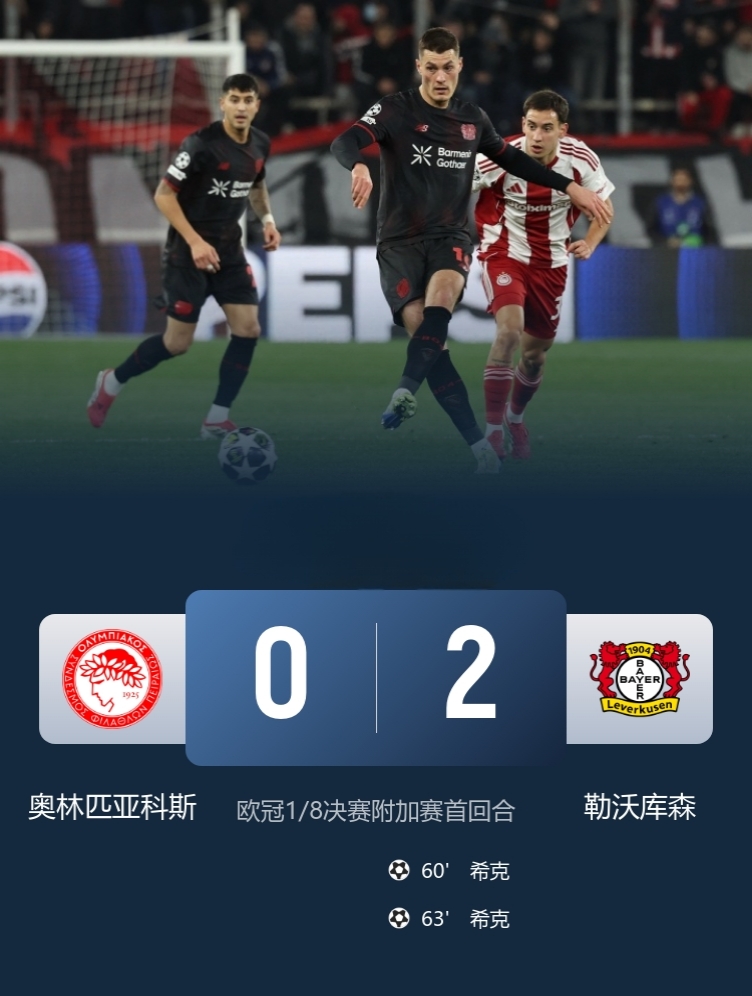 Olympiacos 0-2 Bayer LeverkusenIn this match, Schick scored twice, while Pohjanpalo missed a one-on-one chance! Bundesliga teams remain impressive; when facing weaker opponents, they secure wins reliably and gain an advantage toward qualification.