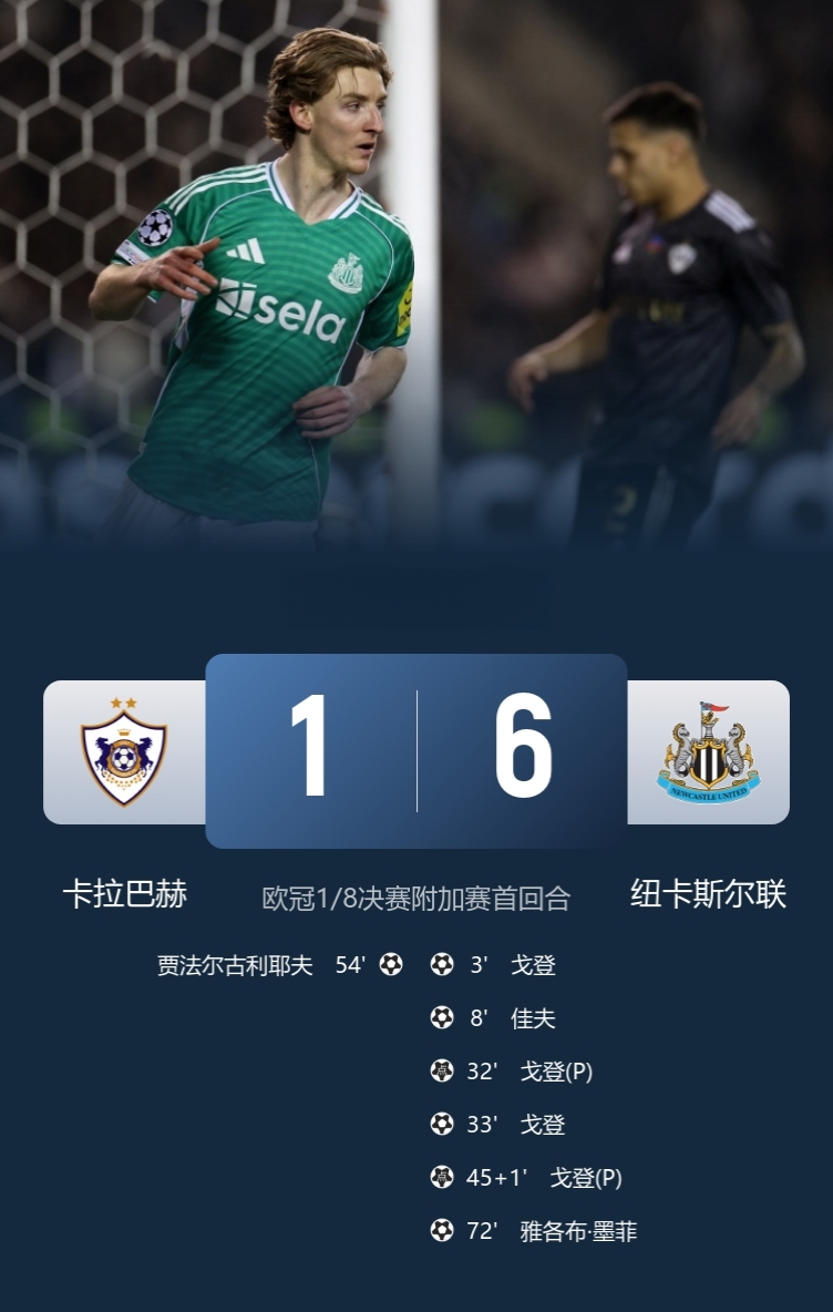Qarabağ 1-6 NewcastleFive Premier League clubs—Arsenal, Tottenham, Liverpool, Manchester City, and Chelsea—have already qualified directly for the Champions League knockout stage. Another English team, Newcastle, participating in the Champions League, earned a spot in the knockout play-off. The Magpies faced an easy opponent, sweeping Qarabağ 6-1 away in the first leg, with Gordon scoring four goals before halftime. This means Newcastle has effectively entered the Champions League knockout stage, marking the first time this season that six Premier League teams will compete in the knockout rounds!
