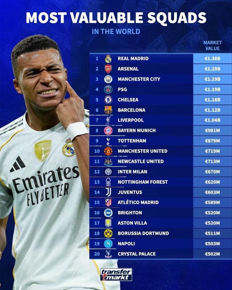 According to Transfermarkt, Real Madrid ranks first globally in squad value at 1.4 billion euros. The two most expensive stars are Kylian Mbappe and Jude Bellingham, both valued at 180 million euros, followed by Vinicius Jr at 150 million euros. Behind Real Madrid are Arsenal (1.31 billion euros), Manchester City (1.21 billion euros), Liverpool and PSG, both at 1.15 billion euros.