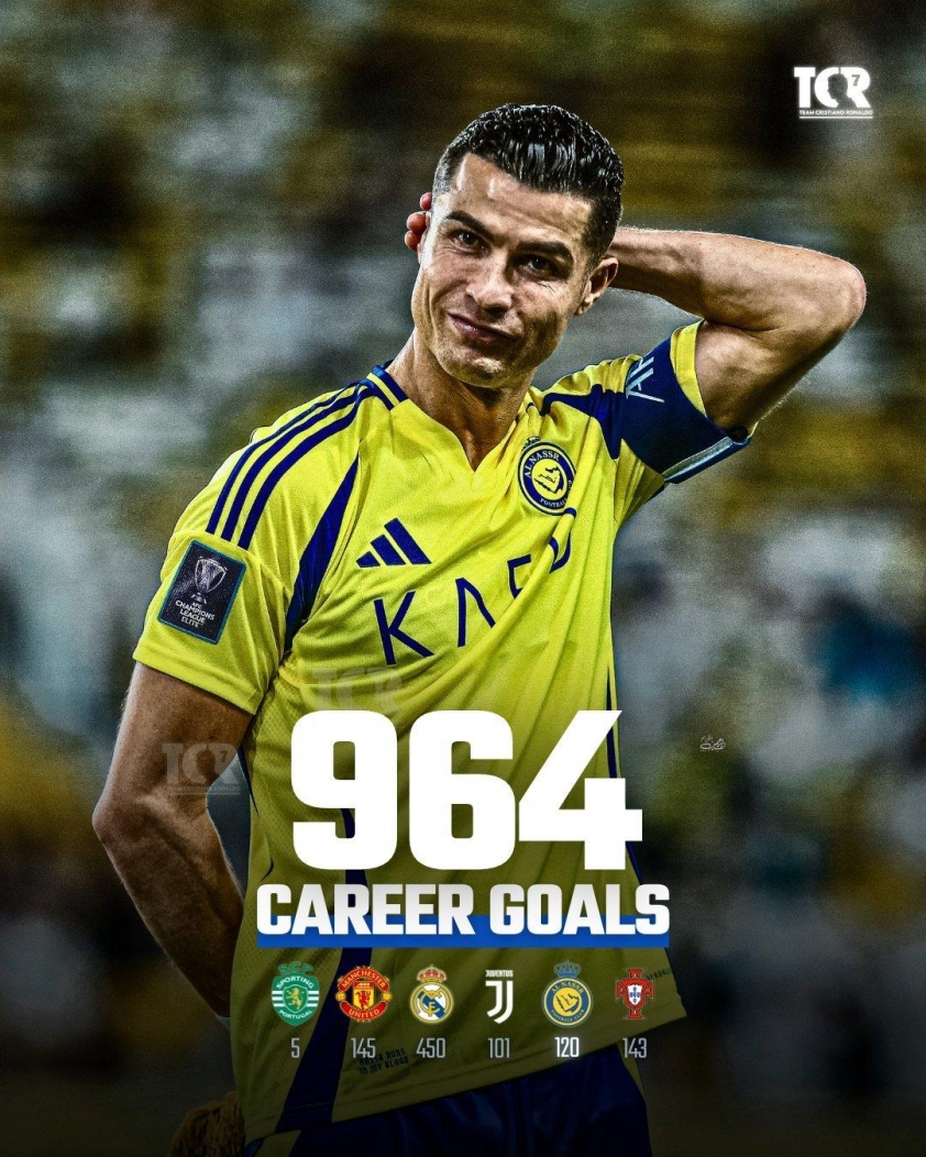 Currently, Ronaldo has 964 career goals, just 36 goals short of the 1,000 milestone. If he keeps up his current scoring rate, he could become the first player in history to reach four digits within this year.